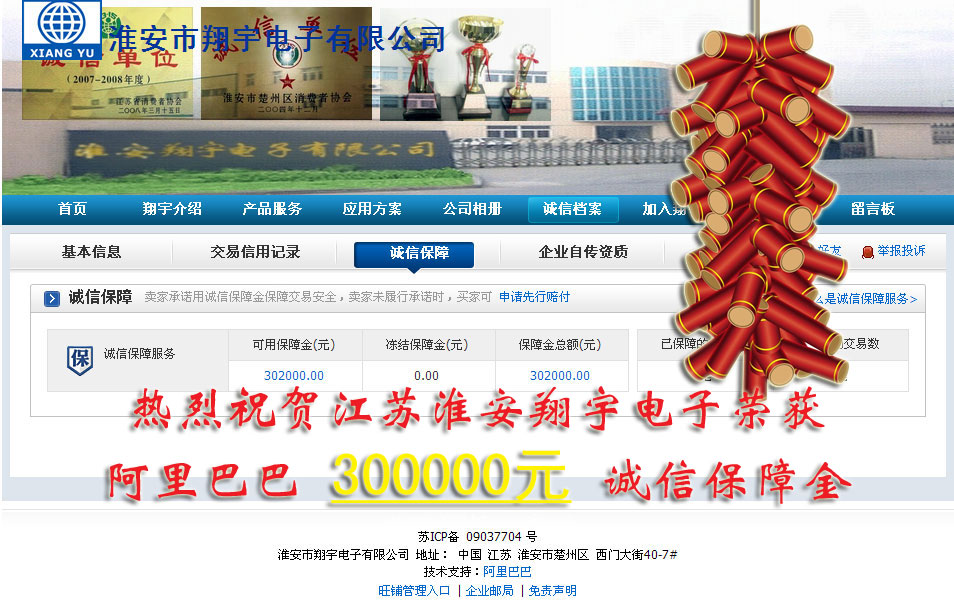 熱烈祝賀我公司江蘇淮安翔宇電子有限公司榮獲阿里巴巴誠信通300000元誠信保障金,感謝阿里巴巴公司以及工作人員對我們堅持誠信,堅持優(yōu)質(zhì)優(yōu)價的認可與肯定, 我們將一如既往堅持誠信,做好產(chǎn)品,做好服務(wù),來回報廣大消費者的厚愛與信任,并再次感謝阿里巴巴公司,誠信通電子商務(wù)平臺以及阿里巴巴工作人員努力。我們與阿里巴巴同樣執(zhí)著于電子商務(wù)的開拓與發(fā)展,堅信電子商務(wù)是現(xiàn)在也是未來商務(wù)的發(fā)展。